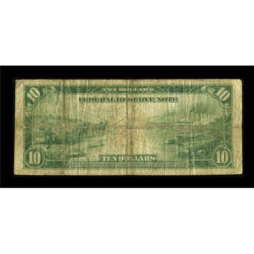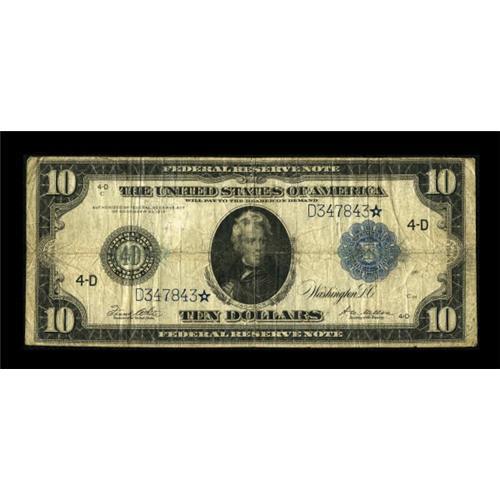 <B>Fr. 919c $10 1914 Federal Reserve Star Note Very Good.</B></I> The sale of the O'Neal Collection marks the first time that this unique note has been available at public sale. No example of this Friedberg number was known until this piece surfaced in 2003, and it remains a one of a kind item today. It's well circulated but intact, with a more than acceptable appearance considering its rarity. Any estimate here is simply a guess, but for the serious collector of star notes, this piece represents one of the holy grail items which simply must be obtained if their collection ever stands a chance of becoming complete. <BR><I>From The Lawrence O'Neal Collection</B></I><BR><BR><b>Shipping:</b> Coins & Currency (<a target="_blank" href="http://www.heritageauctions.com/common/shipping.php">view shipping information</a>)