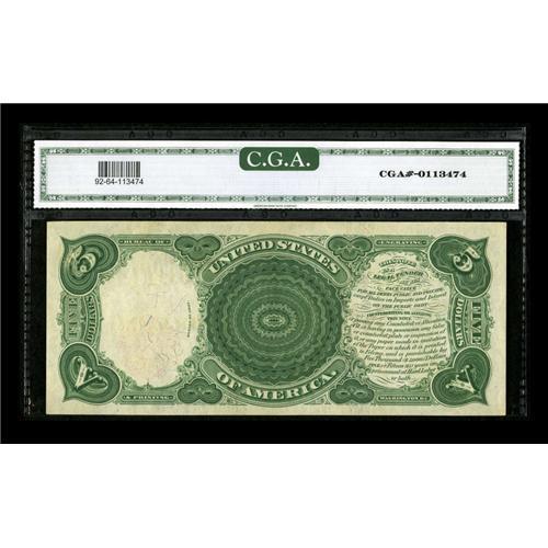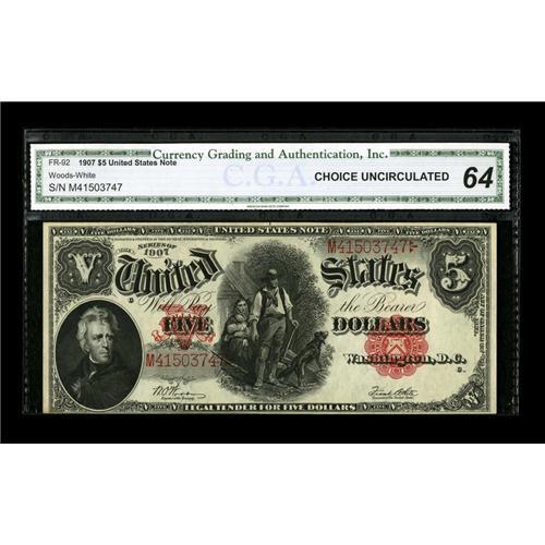 <B>Fr. 92 $5 1907 Legal Tender CGA Choice Uncirculated 64.</B></I> The final signature combination of the Pioneer Family Type, and a much scarcer number. The 64 grade is no doubt the result of the tight bottom margin, as the note appears Gem in all other respects. The paper originality is clearly seen through the third party holder.<BR><BR><b>Shipping:</b> Coins & Currency (<a target="_blank" href="http://www.heritageauctions.com/common/shipping.php">view shipping information</a>)