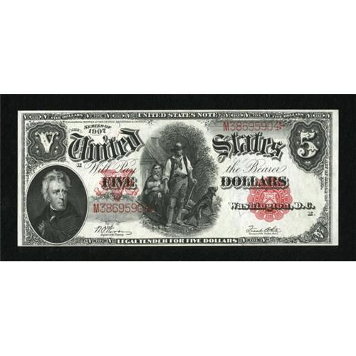 <B>Fr. 92 $5 1907 Legal Tender Choice About New.</B></I> Vivid colors and strong embossing highlight this note that is a little less common than Fr. 91 examples.<BR><BR><b>Shipping:</b> Coins & Currency (<a target="_blank" href="http://www.heritageauctions.com/common/shipping.php">view shipping information</a>)