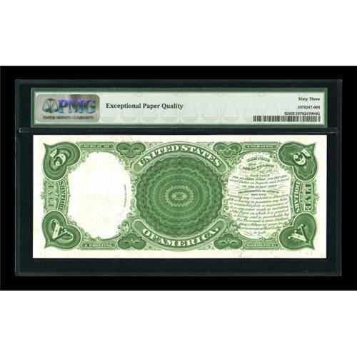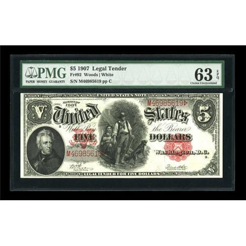 <B>Fr. 92 $5 1907 Legal Tender PMG Choice Uncirculated 63 EPQ.</B></I> The final signature combination of the Pioneer Family Type, and a much scarcer number. A tight top margin certainly withheld a higher grade on this beauty with paper originality that is clearly seen through the third party holder.<B><BR></B></I><I>From The John Ameen Collection</B></I><BR><BR><b>Shipping:</b> Coins & Currency (<a target="_blank" href="http://www.heritageauctions.com/common/shipping.php">view shipping information</a>)