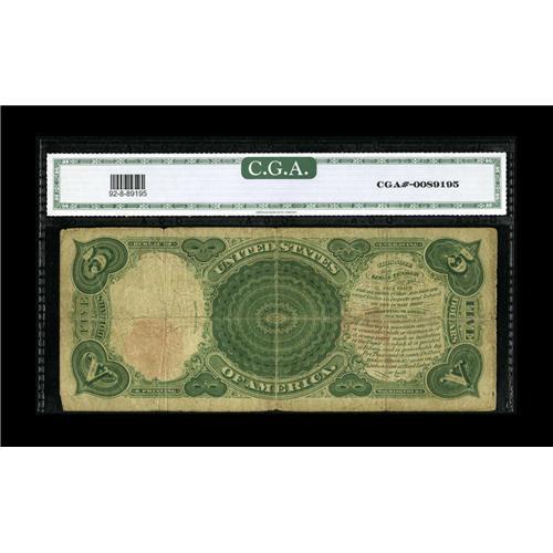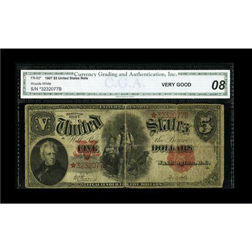 <B>Fr. 92 $5 1907 Legal Tender Star Note CGA Very Good 08.</B></I> This note brings the number to six examples of this Star note known. A few hard folds are seen on this otherwise complete note.