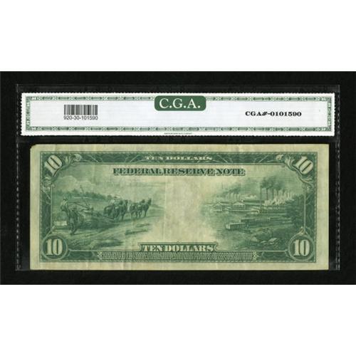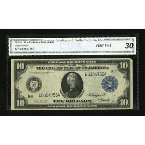 <B>Fr. 920 $10 1914 Federal Reserve Note CGA Very Fine 30.</B></I> The folds that account for the grade can more accurately be described as bends. A deep overprint complements the bright paper.<BR><BR><b>Shipping:</b> Coins & Currency (<a target="_blank" href="http://www.heritageauctions.com/common/shipping.php">view shipping information</a>)