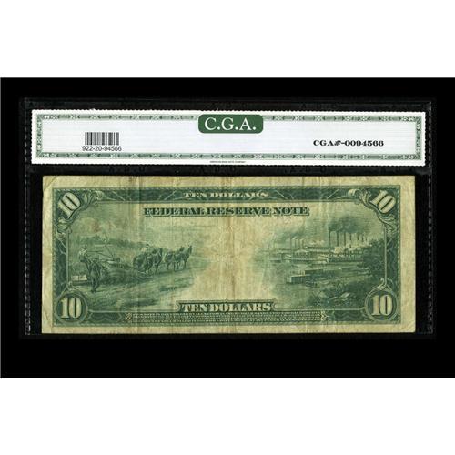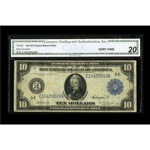 <B>Fr. 922 $10 1914 Federal Reserve Note CGA Very Fine 20.</B></I> Wholly intact and free of splits or pinholes.