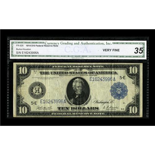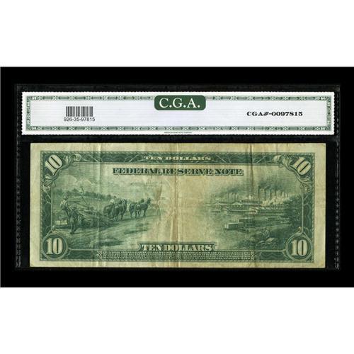 <B>Fr. 923 $10 1914 Federal Reserve Note CGA Very Fine 35.</B></I> We must note the Friedberg number on the third party holder is incorrect for this Burke-Houston signature combination.