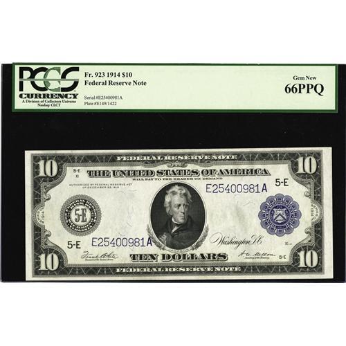 <B>Fr. 923 $10 1914 Federal Reserve Note PCGS Gem New 66PPQ.</B></I> Not much improvement can be had on this Richmond Sawbuck that is blast white with in your face embossed surfaces.