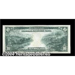 Fr. 927a $10 1914 Federal Reserve Note Superb Gem New. A slightly scarcer note, with only about two dozen examples known. This broadly margined, strictly original, perfect piece has got to be one of the very best of them. <BR><BR><B>Important notice:</B> Heritage usually auctions material at the rate of 200-250 lots per hour. On some occasions eBay Live bid software or the Internet may not be able to keep up with the pace of the auction. We recommend placing a realistic absentee bid now as insurance to avoid disappointment. Occasionally the auctioneer may eliminate or reject an eBay Live bid, and the auctioneer may also reopen a lot after the close of the eBay live bidding (usually because we missed an audience bid), and may reject your bid even if it shows you as the winning bidder. By bidding via eBay Live, you agree that Heritage may award the lot to another bidder at its sole discretion under the circumstances described above or any other reasonable circumstances. Since eBay bids are not shown to us until we open the lot on the floor, we treat those bids just like floor bids. In most cases the floor responds before the eBay bid is presented to us, due to Internet lag time, so for consistency we have made it a policy that floor bids are always considered first over tie eBay live bids. Also please note that all Heritage lots purchased through eBay Live carry a 20% Buyer's Premium. Please make sure you read the Terms and Conditions before you bid. <BR><BR><B>IMPORTANT ANNOUNCEMENT ABOUT RESERVES:</B> Heritage now divulges all reserves on its web site 7 days before every auction. If you want to know whether the reserve on this lot has been met, and if not, what the reserve amount is, please visit this lot page on the HeritageCoin.com web site, or email: bid@HeritageGalleries.com