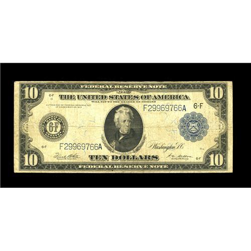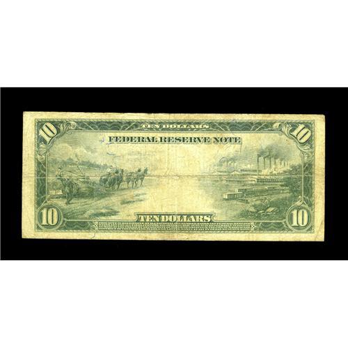 <B>Fr. 927b $10 1914 Federal Reserve Note Fine.</B></I> This note embodies the perfect Fine grade, with even circulation, solid paper, and no holes, tears, or stains. What's more, it's the "b" type which current census figures indicate a surviving population of less than 20 pieces.