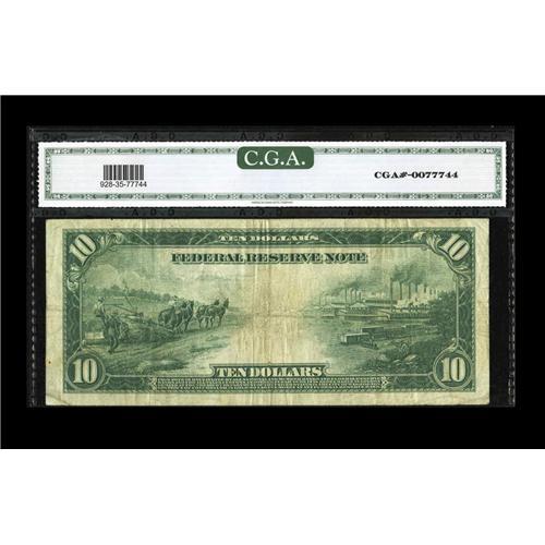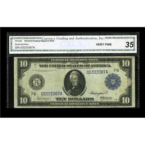 <B>Fr. 928 $10 1914 Federal Reserve Note CGA Very Fine 35.</B></I> Solid for the grade with great paper quality.
