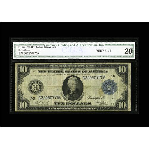 Fr. 929 $10 1914 Federal Reserve Note CGA Very Fine 20. Fr. 929 $10 1914 Federal Reserve Note CGA Ve