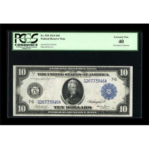 <B>Fr. 929 $10 1914 Federal Reserve Note PCGS Extremely Fine 40.</B></I> A most pleasing example which carries the Burke/Glass signature combination.<BR><BR><b>Shipping:</b> Coins & Currency (<a target="_blank" href="http://www.heritageauctions.com/common/shipping.php">view shipping information</a>)