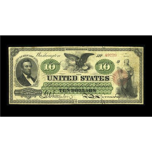 <B>Fr. 93 $10 1862 Legal Tender Fine.</B></I> This is an evenly circulated example with an approximate quarter inch edge tear to the left of the portrait.<BR><BR><b>Shipping:</b> Coin/Currency (<a target="_blank" href="http://www.heritageauctions.com/common/shipping.php">view shipping information</a>)