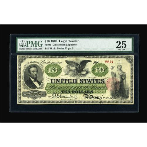 <B>Fr. 93 $10 1862 Legal Tender PMG Very Fine 25.</B></I> Strictly problem free surfaces are noticed on this early Legal Tender though the seal is a touch faded.<BR><BR><b>Shipping:</b> Coins & Currency (<a target="_blank" href="http://www.heritageauctions.com/common/shipping.php">view shipping information</a>)