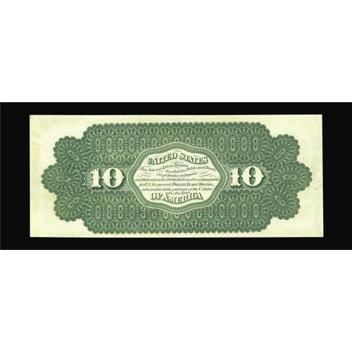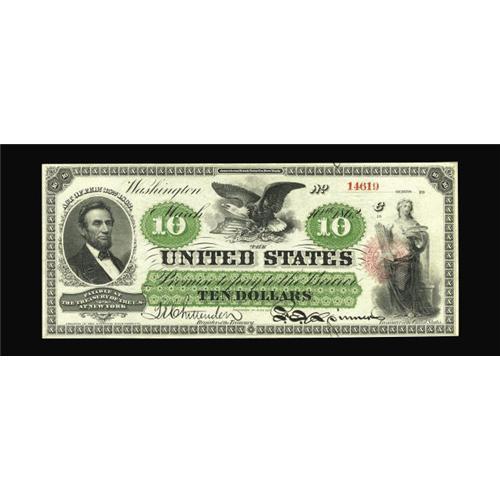 <B>Fr. 93 $10 1862 Legal Tender Very Choice New.</B></I> This $10 Legal is one of the better presentations of the design we have seen. Though the seal is a touch light, the colors are as bright as we've seen, especially the green print. The margins are much larger than normally encountered and outside of a thin lower right corner, they are sufficient for Gem. Close inspection of the paper reveals the much desired egg-shell texture seen only on wholly original pieces. The only grade limiting factor seems to be a bit of handling in a couple areas.<BR><I>From The Plymouth Rock Collection</B></I>