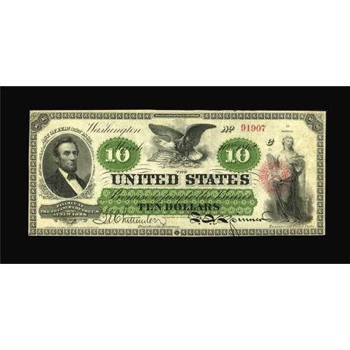 <B>Fr. 93 $10 1862 Legal Tender Very Fine-Extremely Fine.</B></I> Lots of color on this somewhat closely-margined early Legal Ten. There are two minor corner-tip repairs, but they are barely noticeable.<BR><I>From The John Ameen Collection</B></I><BR><BR><b>Shipping:</b> Coins & Currency (<a target="_blank" href="http://www.heritageauctions.com/common/shipping.php">view shipping information</a>)