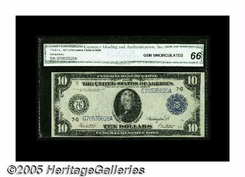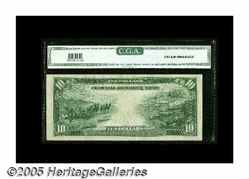<B>Fr. 931a $10 1914 Federal Reserve Note CGA Gem Uncirculated 66.</B></I> A really good-looking example of a basic number of this type. With about 70 pieces known, no additional value attaches for scarcity. If you are looking for a high grade, third party $10 Fed, this note is ideal.