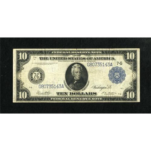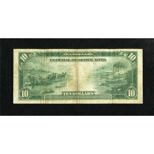<B>Fr. 931b $10 1914 Federal Reserve Note Fine.</B></I> The "b" variety has the smaller district designation in the lower left-hand corner and is usually scarcer than the "a" variety. <BR><BR><b>Shipping:</b> Coins & Currency (<a target="_blank" href="http://www.heritageauctions.com/common/shipping.php">view shipping information</a>)