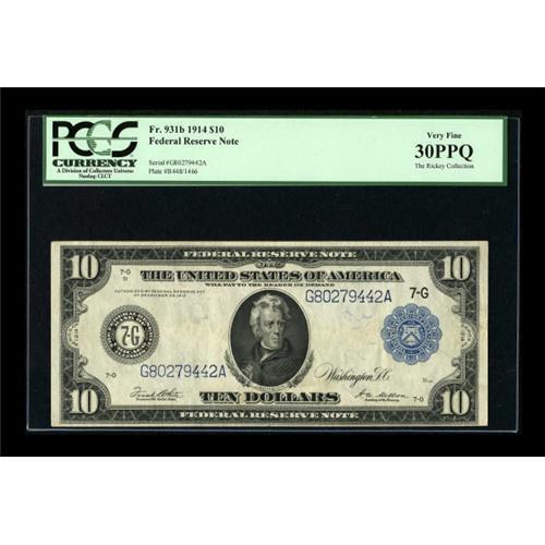 <B>Fr. 931b $10 1914 Federal Reserve Note PCGS Very Fine 30PPQ.</B></I> This piece is the better "B" variety with a small district letter and number in the lower left corner.<BR><BR><b>Shipping:</b> Coins & Currency (<a target="_blank" href="http://www.heritageauctions.com/common/shipping.php">view shipping information</a>)