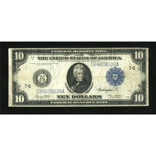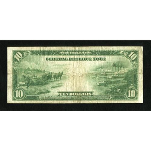 <B>Fr. 931c $10 1914 Federal Reserve Note Fine.</B></I> This is by far the most elusive of the three varieties for this Friedberg number. This "c" variety is distinguished by the seals being moved closer to the portrait. The "c" variety is outnumbered by a three-to-one margin by the "b" variety, and by a five-to-one margin by the "a" variety.<BR><BR><b>Shipping:</b> Coins & Currency (<a target="_blank" href="http://www.heritageauctions.com/common/shipping.php">view shipping information</a>)