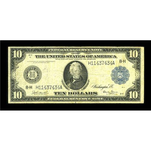 <B>Fr. 933 $10 1914 Federal Reserve Note Fine.</B></I> An honest and unmolested example of this better Burke-Glass number.<BR><BR><b>Shipping:</b> Coins & Currency (<a target="_blank" href="http://www.heritageauctions.com/common/shipping.php">view shipping information</a>)