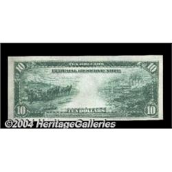 Fr. 933 $10 1914 Federal Reserve Note Gem New. Excellent original embossing and lots of color all combine on this scarce Burke-Glass St. Louis District Ten. This is the ninth example CAA has sold, which is well more than half of the total known notes. <BR><BR><B>Important notice:</B> Heritage usually auctions material at the rate of 200-250 lots per hour. On some occasions eBay Live bid software or the Internet may not be able to keep up with the pace of the auction. We recommend placing a realistic absentee bid now as insurance to avoid disappointment. Occasionally the auctioneer may eliminate or reject an eBay Live bid, and the auctioneer may also reopen a lot after the close of the eBay live bidding (usually because we missed an audience bid), and may reject your bid even if it shows you as the winning bidder. By bidding via eBay Live, you agree that Heritage may award the lot to another bidder at its sole discretion under the circumstances described above or any other reasonable circumstances. Since eBay bids are not shown to us until we open the lot on the floor, we treat those bids just like floor bids. In most cases the floor responds before the eBay bid is presented to us, due to Internet lag time, so for consistency we have made it a policy that floor bids are always considered first over tie eBay live bids. Also please note that all Heritage lots purchased through eBay Live carry a 20% Buyer's Premium. Please make sure you read the Terms and Conditions before you bid. <BR><BR><B>IMPORTANT ANNOUNCEMENT ABOUT RESERVES:</B> Heritage now divulges all reserves on its web site 7 days before every auction. If you want to know whether the reserve on this lot has been met, and if not, what the reserve amount is, please visit this lot page on the HeritageCoin.com web site, or email: bid@HeritageGalleries.com