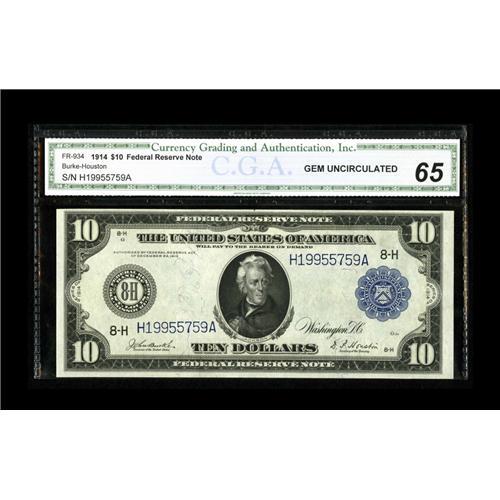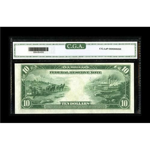 <B>Fr. 934 $10 1914 Federal Reserve Note CGA Gem Uncirculated 65.</B></I> The margins exhibited here are much larger than usually seen on the issue, thus the slightly smaller top margin does not affect the grade as much as would be expected.<BR><BR><b>Shipping:</b> Coin/Currency (<a target="_blank" href="http://www.heritageauctions.com/common/shipping.php">view shipping information</a>)