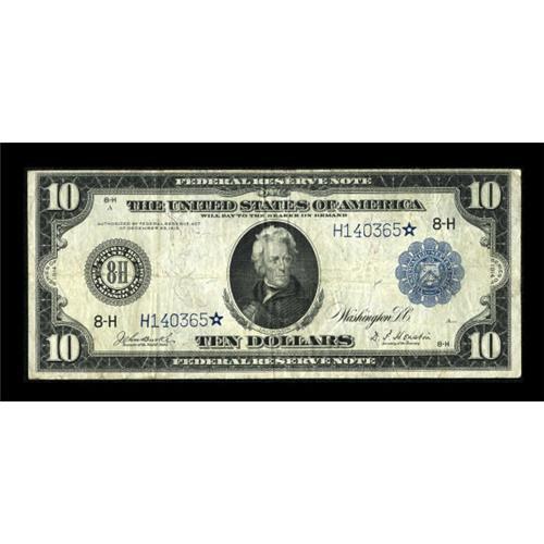 <B>Fr. 934 $10 1914 Federal Reserve Star Note Fine-Very Fine.</B></I> While not a truly rare number for stars, with fifteen examples reported, this St. Louis district specimen is one of the nicer pieces known. Only two are truly high grade, with all of the others grading Fine-Very Fine or lower. This is a nicely colored and problem free piece for the grade. <BR><I>From The Lawrence O'Neal Collection</B></I><BR><BR><b>Shipping:</b> Coins & Currency (<a target="_blank" href="http://www.heritageauctions.com/common/shipping.php">view shipping information</a>)