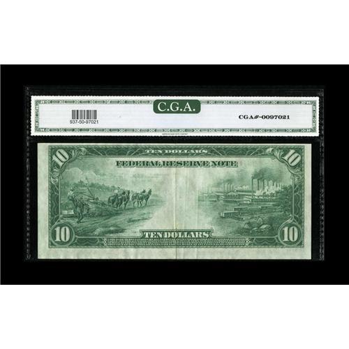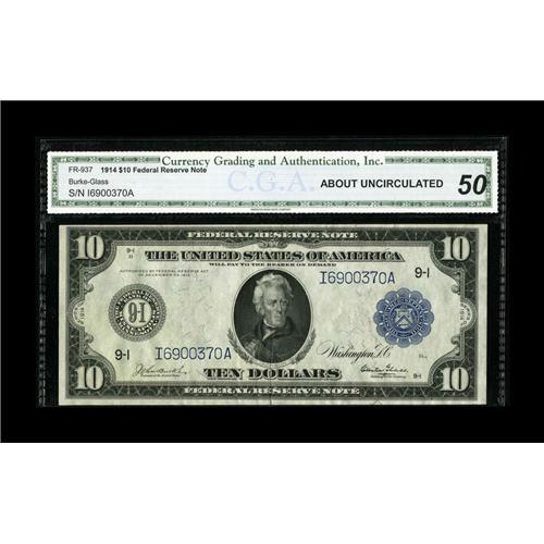 <B>Fr. 937 $10 1914 Federal Reserve Note CGA About Uncirculated 50.</B></I> This example is represented by a handful of notes in high grade. Some vertical folds are noticed.