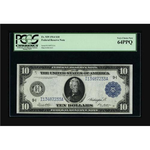 <B>Fr. 939 $10 1914 Federal Reserve Note PCGS Very Choice New 64PPQ.</B></I> One of the more common Fed $10s and a nice example for the type.<BR><BR><b>Shipping:</b> Coin/Currency (<a target="_blank" href="http://www.heritageauctions.com/common/shipping.php">view shipping information</a>)