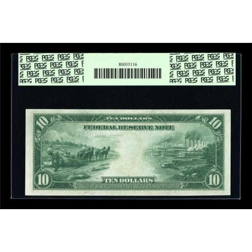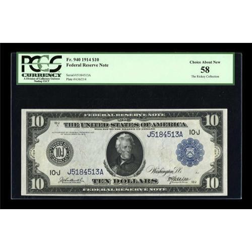 <B>Fr. 940 $10 1914 Federal Reserve Note PCGS Choice About New 58.</B></I> No folds or handling are immediately visible through the holder.<BR><BR><b>Shipping:</b> Coins & Currency (<a target="_blank" href="http://www.heritageauctions.com/common/shipping.php">view shipping information</a>)