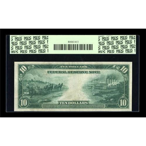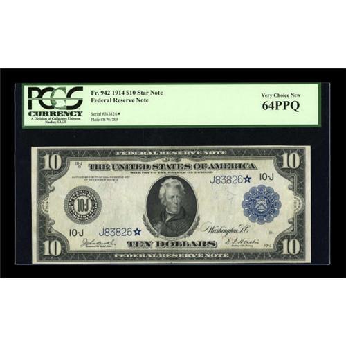 <B>Fr. 942 $10 1914 Federal Reserve Star Note PCGS Very Choice New 64PPQ.</B></I> Thirteen Fr. 942 stars are known, with four of that number, including this specimen, grading uncirculated. We sold a Very Fine-Extremely Fine Fr. 942 in our last sale. Starting with a pre-sale estimate of $1250-up, it realized a startling $4600, giving some previously skeptical observers a quick education on how popular high grade large size stars had become. This example, graded Very Choice New 64 and bearing PCGS' coveted PPQ designation, will likely bring considerably in excess of that earlier figure. <BR><I>From The Lawrence O'Neal Collection</B></I><BR><BR><b>Shipping:</b> Coins & Currency (<a target="_blank" href="http://www.heritageauctions.com/common/shipping.php">view shipping information</a>)