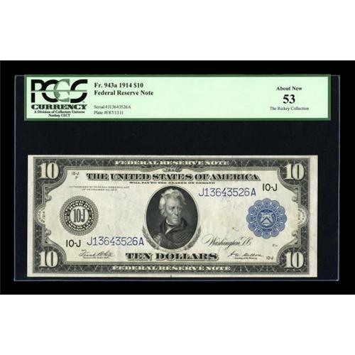 <B>Fr. 943a $10 1914 Federal Reserve Note PCGS About New 53.</B></I> Two light bends are noted on this attractive issue.<BR><BR><b>Shipping:</b> Coins & Currency (<a target="_blank" href="http://www.heritageauctions.com/common/shipping.php">view shipping information</a>)