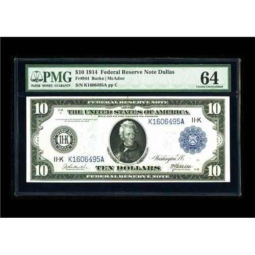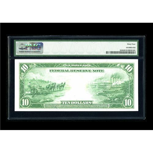 <B>Fr. 944 $10 1914 Federal Reserve Note PMG Choice Uncirculated 64.</B></I> This newly recorded note to the census is one of more than 6.8 million printed. To date though, only about four and half dozen notes are known, fewer than ten of which are Uncirculated. The margins are fully sufficient for a Gem grade.<BR><I>From The Bill and Kathy Stella Currency Collection</B></I><BR><BR><b>Shipping:</b> Coin/Currency (<a target="_blank" href="http://www.heritageauctions.com/common/shipping.php">view shipping information</a>)