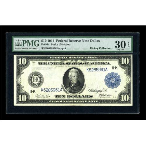 <B>Fr. 944 $10 1914 Federal Reserve Note PMG Very Fine 30 EPQ.</B></I> A very attractive note for VF, with only one significant fold.<BR><BR><b>Shipping:</b> Coins & Currency (<a target="_blank" href="http://www.heritageauctions.com/common/shipping.php">view shipping information</a>)