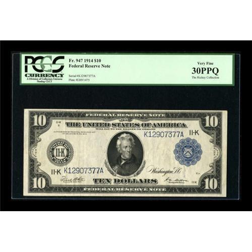 <B>Fr. 947 $10 1914 Federal Reserve Note PCGS Very Fine 30PPQ.</B></I> The Dallas district has always been an elusive issue for this series. Bright with minimal folds noticed.<BR><BR><b>Shipping:</b> Coins & Currency (<a target="_blank" href="http://www.heritageauctions.com/common/shipping.php">view shipping information</a>)