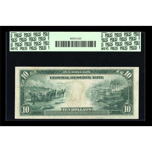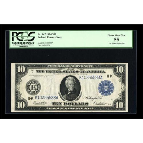 <B>Fr. 947 $10 1914 Federal Reserve Note PCGS Choice About New 55.</B></I> Original paper waves are noted in the holder. The deep blue overprint is as bold as when it was printed. PMG has only graded 14 examples of this number (PCGS has yet to release its population report), with only four pieces coming in above the Extremely Fine 40 level. <BR><BR><b>Shipping:</b> Coins & Currency (<a target="_blank" href="http://www.heritageauctions.com/common/shipping.php">view shipping information</a>)