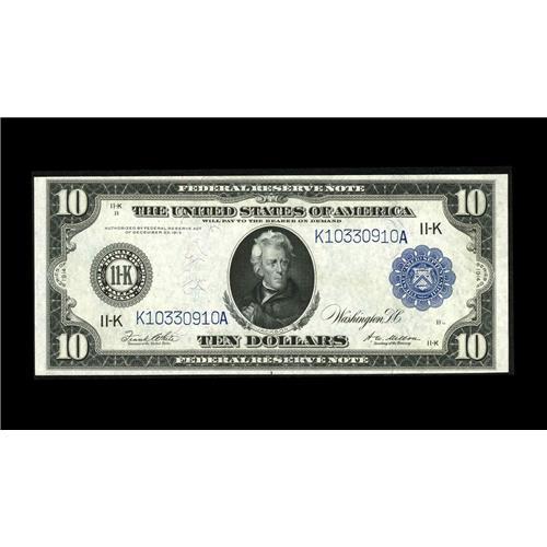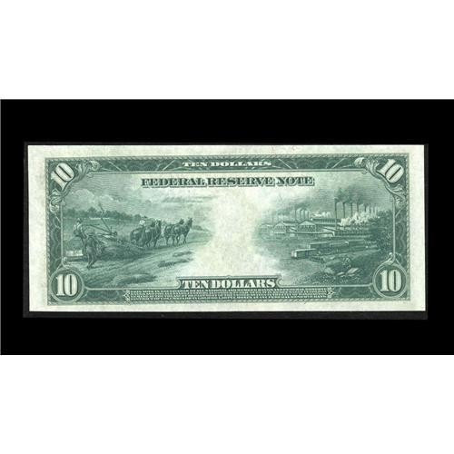 <B>Fr. 947 $10 1914 Federal Reserve Note Very Choice New.</B></I> Only about 20 of this number are known and very few could be nicer than this lovely example.