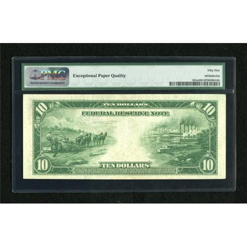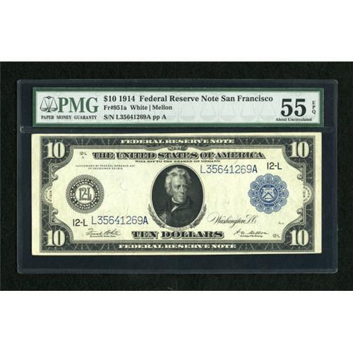 <B>Fr. 951a $10 1914 Federal Reserve Note PMG About Uncirculated 55 EPQ.</B></I> A faint center bend is noted on this pleasingly original issue. Some rounding of the corners is noted, but does not detract from the sizeable margins seen on all four sides.<BR><I>From The Warren Marshall Collection</B></I><BR><BR><b>Shipping:</b> Coins & Currency (<a target="_blank" href="http://www.heritageauctions.com/common/shipping.php">view shipping information</a>)