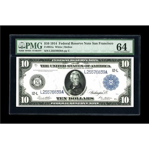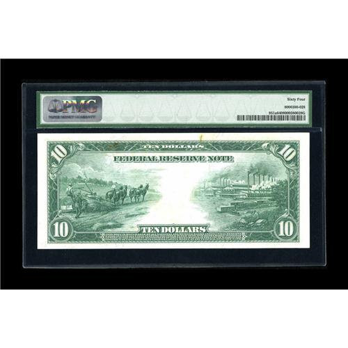 <B>Fr. 951a $10 1914 Federal Reserve Note PMG Choice Uncirculated 64.</B></I> This note falls right into a small run of uncirculated notes recorded in the census. Surprisingly, even with huge and even margins, this note missed a full Gem grade. The only grade limiting factor may be a bit of soiling on back at the top.<BR><BR><b>Shipping:</b> Coin/Currency (<a target="_blank" href="http://www.heritageauctions.com/common/shipping.php">view shipping information</a>)