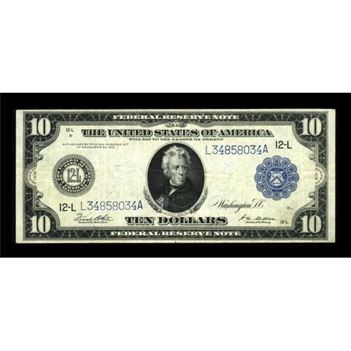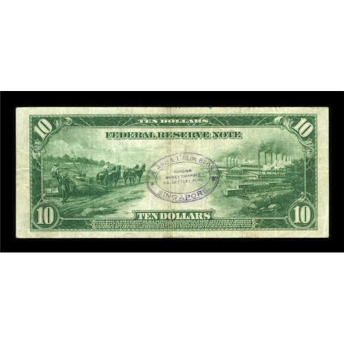 <B>Fr. 951a $10 1914 Federal Reserve Note Very Fine.</B></I> A natural mid-range VF, but it is perfect from the face. The back bears an interesting bank-style stamp that we have not seen before--it is from a foreign money changer located on Battery Road in Singapore. The address appears to be "8-A Battery Road", but I would check first before attempting an unannounced visit. Interesting and unusual. <BR><I>From The Warren Marshall Collection</B></I><BR><BR><b>Shipping:</b> Coins & Currency (<a target="_blank" href="http://www.heritageauctions.com/common/shipping.php">view shipping information</a>)