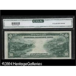 Fr. 951c $10 1914 Federal Reserve Note Extremely Fine+. <B>Fr. 951c $10 1914 Federal Reserve Note CGA Crisp Uncirculated 62.</B></I> The third-party holder reveals embossing and a svelte bottom margin on this scarcer variety. This note is not listed in the census which carries only one note graded in CU. <BR><BR><B>Important notice:</B> Heritage usually auctions material at the rate of 200-250 lots per hour. On some occasions eBay Live bid software or the Internet may not be able to keep up with the pace of the auction. We recommend placing a realistic absentee bid now as insurance to avoid disappointment. Occasionally the auctioneer may eliminate or reject an eBay Live bid, and the auctioneer may also reopen a lot after the close of the eBay live bidding (usually because we missed an audience bid), and may reject your bid even if it shows you as the winning bidder. By bidding via eBay Live, you agree that Heritage may award the lot to another bidder at its sole discretion under the circumstances described above or any other reasonable circumstances. Since eBay bids are not shown to us until we open the lot on the floor, we treat those bids just like floor bids. In most cases the floor responds before the eBay bid is presented to us, due to Internet lag time, so for consistency we have made it a policy that floor bids are always considered first over tie eBay live bids. Also please note that all Heritage lots purchased through eBay Live carry a 20% Buyer's Premium. Please make sure you read the Terms and Conditions before you bid. This lot is being auctioned in conjunction with a live floor auction by Heritage Galleries & Auctioneers. All final auction and invoice information will be supplied by Heritage Galleries & Auctioneers, and all other information should be considered preliminary. Lot:17727