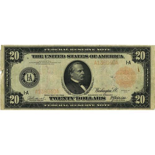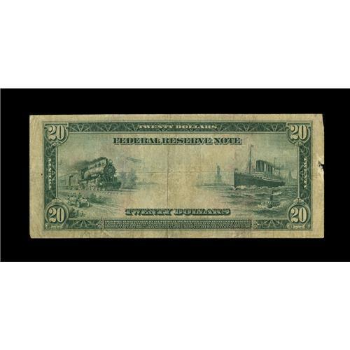 <B>Fr. 952a $20 1914 Red Seal Federal Reserve Note Very Good.</B></I> Offerings of this scarcer Friedberg have been quite infrequent. Though technically a stronger grade paper quality wise, the fading of the overprint moreover determines the grade. Some pinholes and a bit of edge roughness at left are also noticed.