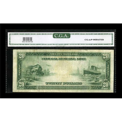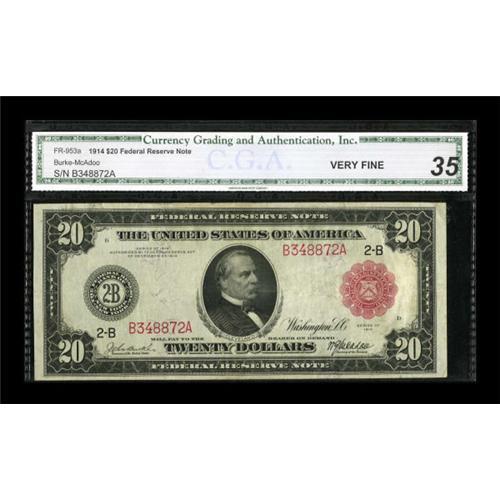 <B>Fr. 953a $20 1914 Red Seal Federal Reserve Note CGA Very Fine 35.</B></I> A tougher colorful Red Seal $20 FRN that has a little margin notch and some light soiling.<BR><BR><b>Shipping:</b> Coins & Currency (<a target="_blank" href="http://www.heritageauctions.com/common/shipping.php">view shipping information</a>)