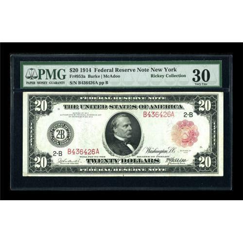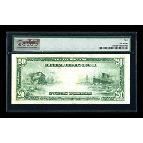 <B>Fr. 953a $20 1914 Red Seal Federal Reserve Note PMG Very Fine 30.</B></I> Broad margins are seen on this mid-grade example. The seal is a touch weak, though the serial numbers are bold.<BR><BR><b>Shipping:</b> Coins & Currency (<a target="_blank" href="http://www.heritageauctions.com/common/shipping.php">view shipping information</a>)