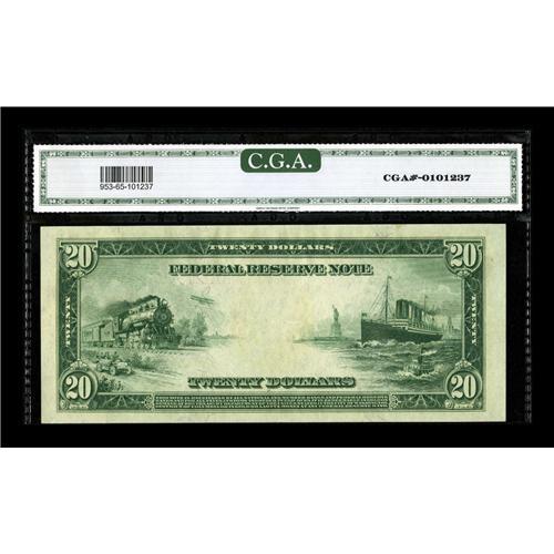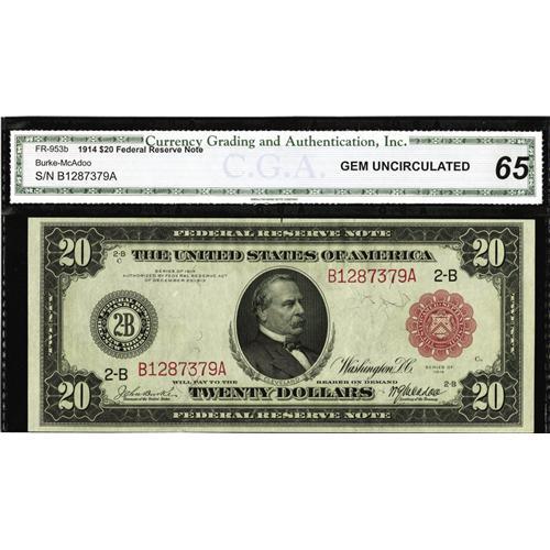 <B>Fr. 953b $20 1914 Red Seal Federal Reserve Note CGA Gem Uncirculated 65.</B></I> CAA sold the sheetmate to this note back in October of 1998. The description read, "Fresh, original, bright, and beautiful. Twenty Dollar Red seals in top grade are few and far between. We can't imagine anyone not liking this beauty." This cataloger feels that it applies here as well.