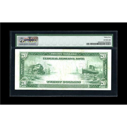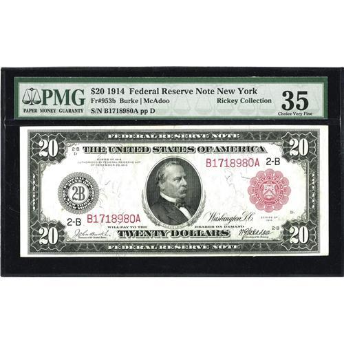 <B>Fr. 953b $20 1914 Red Seal Federal Reserve Note PMG Choice Very Fine 35.</B></I> This ex-Rickey Collection New York $20 has been able to retain its embossing and original paper surfaces.