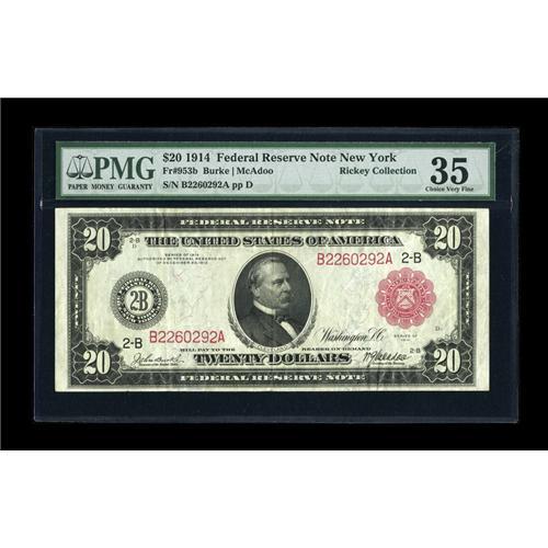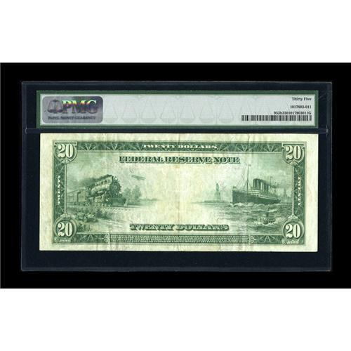 <B>Fr. 953b $20 1914 Red Seal Federal Reserve Note PMG Choice Very Fine 35.</B></I> A bold red seal contrasts nicely against the perfectly original and bright white paper on this moderately circulated issue. Not even a hint of soil is noted making this the ideal VF for any collection.<BR><I>From The Collection of Greg Southward</B></I><BR><BR><b>Shipping:</b> Coins & Currency (<a target="_blank" href="http://www.heritageauctions.com/common/shipping.php">view shipping information</a>)