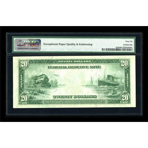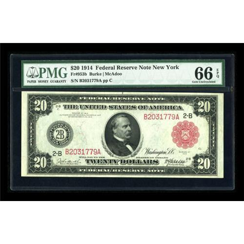 <B>Fr. 953b $20 1914 Red Seal Federal Reserve Note PMG Gem Uncirculated 66 EPQ.</B></I> PMG has graded four Fr. 953b's at this 66 EPQ level, but that is a very deceptive part of the story. Those four notes are the only $20 Red Seals at this level for all Friedberg numbers and districts combined. This is an extremely rare type in Superb condition. The note itself is incredibly well margined, with plainly evident original embossing, and ideal color of the inks and paper. <BR><BR><b>Shipping:</b> Coins & Currency (<a target="_blank" href="http://www.heritageauctions.com/common/shipping.php">view shipping information</a>)
