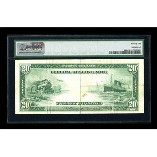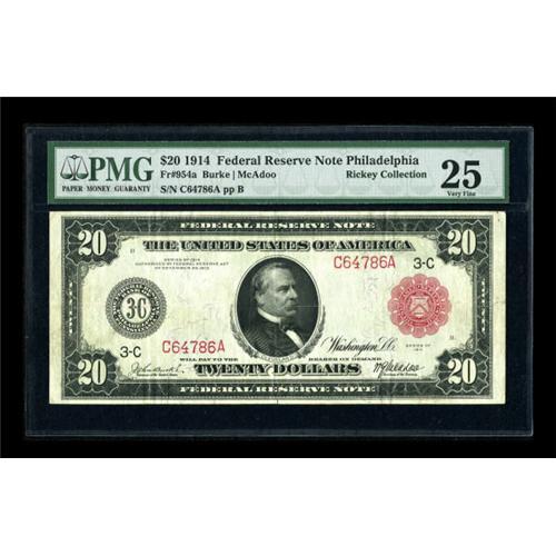 <B>Fr. 954a $20 1914 Red Seal Federal Reserve Note PMG Very Fine 25.</B></I> In the last five years, we have handled only two examples of this scarce Red Seal. Approximately 15 pieces are known with the last VF to appear in our auction realizing $2,300. Boldly printed with a cherry red overprint.<BR><BR><b>Shipping:</b> Coins & Currency (<a target="_blank" href="http://www.heritageauctions.com/common/shipping.php">view shipping information</a>)