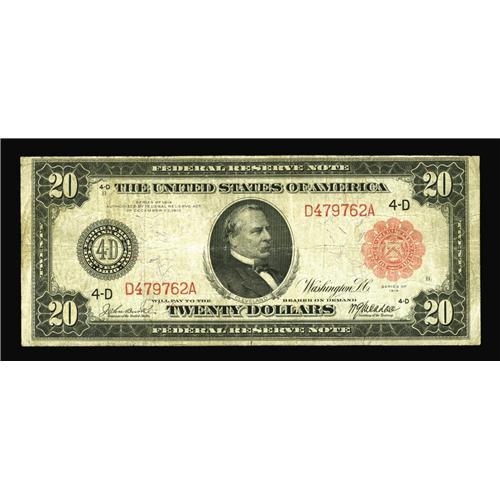 <B>Fr. 955b $20 1914 Red Seal Federal Reserve Note Very Good.</B></I> Here is an evenly circulated survivor that will be a welcome addition to a growing FRN collection.