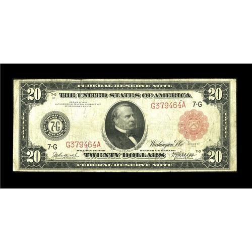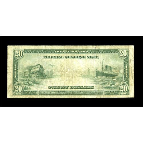 <B>Fr. 958b $20 1914 Red Seal Federal Reserve Note Fine.</B></I> The "b" variety is more than twice as scarce as the "a" variety for this Friedberg number with less than 20 serial numbers recorded. This note exhibits even wear with an approximate quarter inch top edge tear.<BR><BR><b>Shipping:</b> Coins & Currency (<a target="_blank" href="http://www.heritageauctions.com/common/shipping.php">view shipping information</a>)